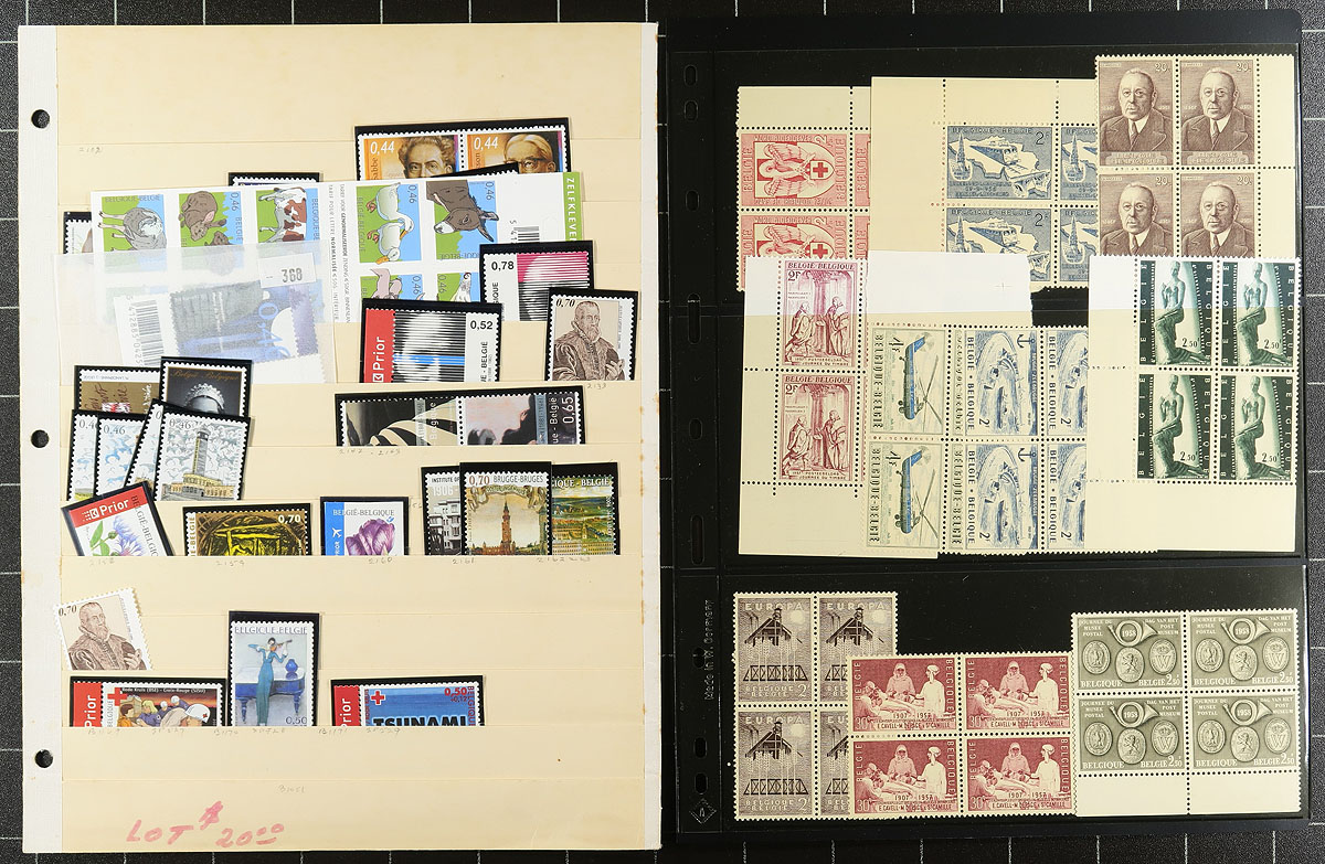 Group of primarily never hinged Belgium, 1900's-2006, containing many hundreds of stamps in a variety of formats including stockpages, 102 cards, glassines, etc. The bulk of the material appears to be post-1950 including singles, sets, a few booklet panes, blocks, semi-postals, and other back of the book material. A spot check indicated some items cataloguing in the $5 to $10 ranges, with the owner's older Scott catalogue value for the lot totaling US$557.00 (with a few more modern stamps not catalogued). A nice lot for the Belgium collector looking to fill holes in albums, or a good way to start a new country. Overall fine to very fine. Estimate =