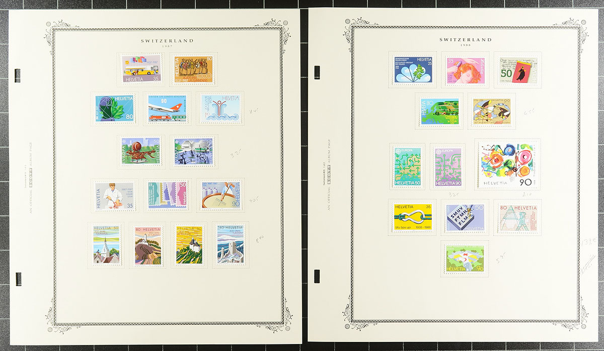 Collection of primarily never hinged Switzerland, 1939-1994, containing about 500 stamps in over 10 stock or album pages. The collection ranges from Scott #328/949, along with a few souvenir sheets and back of the book issues. A spot check indicated some material cataloguing $5 to $10 each, with the owner's 2017 Scott catalogue value for the lot totaling US$932.00. A nice lot for all collectors from this popular collecting country, overall very fine. Estimate =