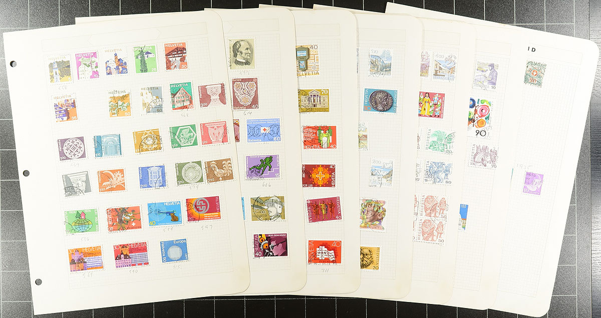 Collection / accumulation of used Switzerland, 1862-2013, containing over 1,500 stamps on several album or stock pages. The collection generally ranges from Scott #53/1496, along with singles and partial sets of semi-postals ranging from #B1/#B40, with some material cataloguing $10 and up. Owner's 2017 Scott catalogue value for the lot totals US$1,057.00, leaving better finds to the dedicated collector. Postmark interest includes cds types among others. A nice lot for all collectors of used material, overall fine to very fine. Estimate =
