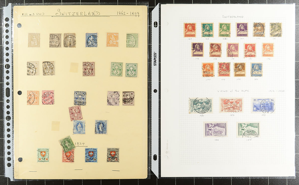 Collection / accumulation of used Switzerland, 1862-2013, containing over 1,500 stamps on several album or stock pages. The collection generally ranges from Scott #53/1496, along with singles and partial sets of semi-postals ranging from #B1/#B40, with some material cataloguing $10 and up. Owner's 2017 Scott catalogue value for the lot totals US$1,057.00, leaving better finds to the dedicated collector. Postmark interest includes cds types among others. A nice lot for all collectors of used material, overall fine to very fine. Estimate =