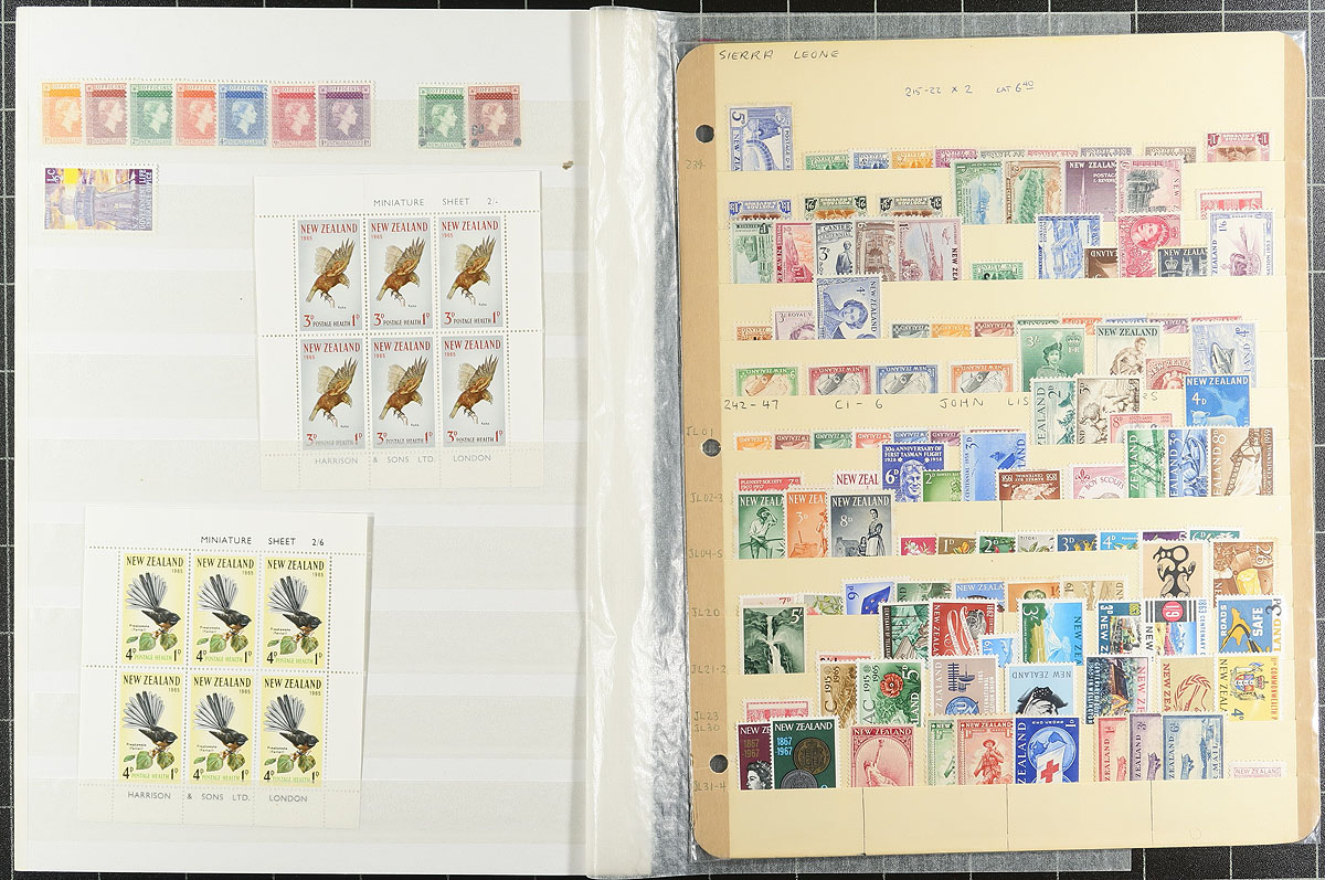 Collection of primarily mint never hinged New Zealand, 1882-2003, containing many hundreds of stamps in roughly 20 stock or album pages. The collection generally ranges from Scott #65/1847, including selection of semi-postals, airmails, a few souvenir sheets, etc. A spot check indicated a few singles, sets, and partial sets cataloguing $15 to $20 and up each. Owner's 2015 Scott catalogue value for the lot totals US$1,744.00, face value alone would be a few hundred dollars. A nice lot for collectors and dealers alike. Estimate =