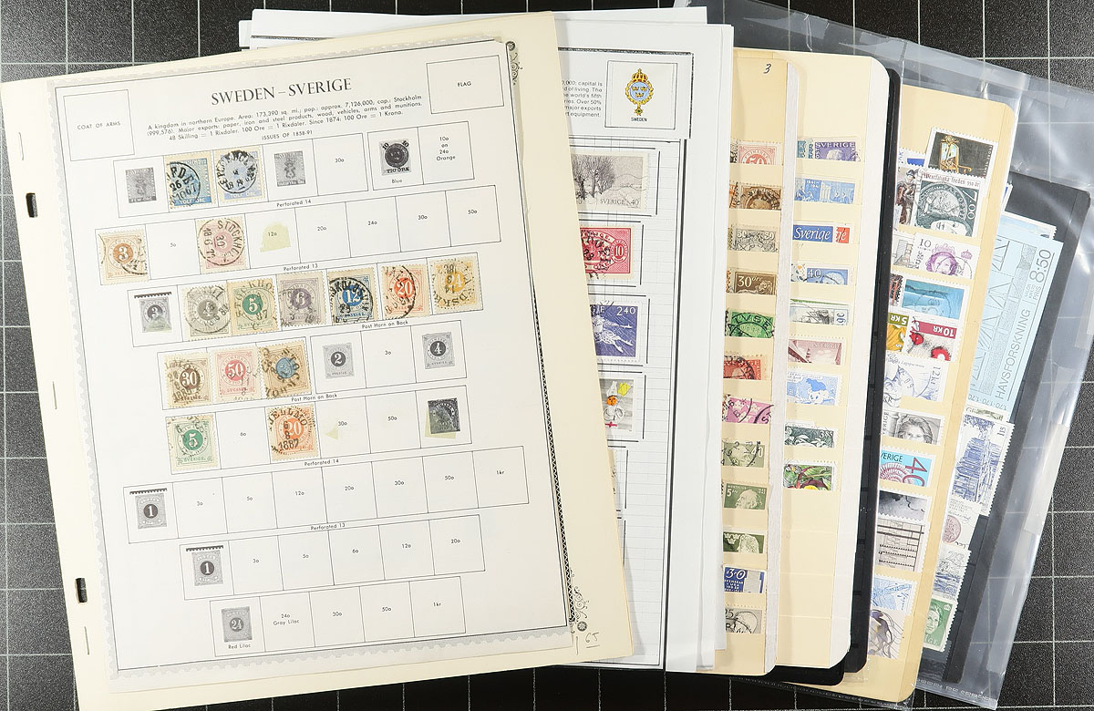 Nice collection / accumulation of used Sweden, 1858-2015, containing over 1,750 stamps in several album or stock pages. The lot generally ranges from Scott #8/2708, including a decent selection of officials, modern issues, and a few souvenir sheets. A spot check indicated a few singles, sets, and partial sets cataloguing $10 and up. Postmark interest includes cds types including some nice "socked on the nose" town cancels. Owner's 2015 Scott catalogue value for the lot totals US$1,308.00 ($1765.80 CDN). A nice lot for Sweden or worldwide used collector, overall fine to very fine. Estimate =