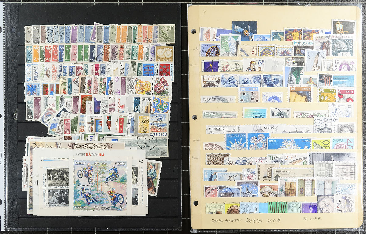 Nice collection / accumulation of used Sweden, 1858-2015, containing over 1,750 stamps in several album or stock pages. The lot generally ranges from Scott #8/2708, including a decent selection of officials, modern issues, and a few souvenir sheets. A spot check indicated a few singles, sets, and partial sets cataloguing $10 and up. Postmark interest includes cds types including some nice "socked on the nose" town cancels. Owner's 2015 Scott catalogue value for the lot totals US$1,308.00 ($1765.80 CDN). A nice lot for Sweden or worldwide used collector, overall fine to very fine. Estimate =