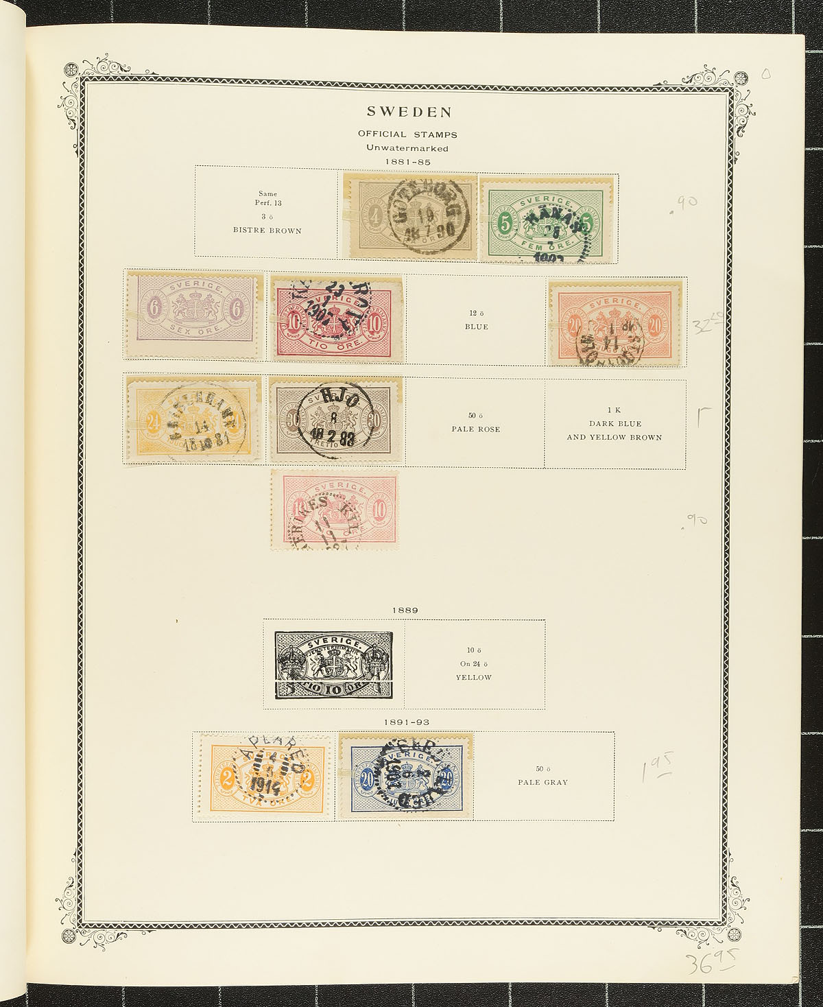 Nice collection / accumulation of used Sweden, 1858-2015, containing over 1,750 stamps in several album or stock pages. The lot generally ranges from Scott #8/2708, including a decent selection of officials, modern issues, and a few souvenir sheets. A spot check indicated a few singles, sets, and partial sets cataloguing $10 and up. Postmark interest includes cds types including some nice "socked on the nose" town cancels. Owner's 2015 Scott catalogue value for the lot totals US$1,308.00 ($1765.80 CDN). A nice lot for Sweden or worldwide used collector, overall fine to very fine. Estimate =