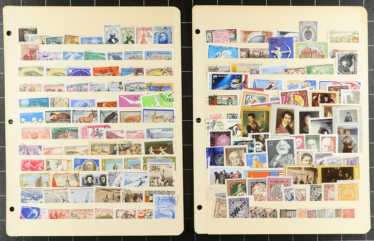 Large offering of primarily used Russia, 1880's-1999, containing a few thousand stamps, in several stock or album pages. The lot generally ranges from Scott #27/6535, noting several sets and partial sets, souvenir sheets, and back of the book material. Owner's 2012 Scott catalogue value for the lot totals US$1,045.00 ($1410.75 CDN, roughly 40c a stamp), leaving better finds to the dedicated collector. It appears some of the used have cto cancels, noting some mild duplication of sine issues, still a nice lot for the worldwide collector. Estimate =