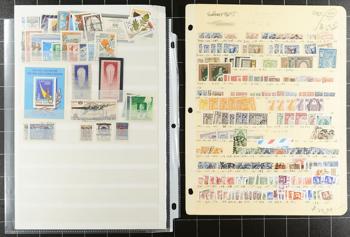 Large offering of primarily used Russia, 1880's-1999, containing a few thousand stamps, in several stock or album pages. The lot generally ranges from Scott #27/6535, noting several sets and partial sets, souvenir sheets, and back of the book material. Owner's 2012 Scott catalogue value for the lot totals US$1,045.00 ($1410.75 CDN, roughly 40c a stamp), leaving better finds to the dedicated collector. It appears some of the used have cto cancels, noting some mild duplication of sine issues, still a nice lot for the worldwide collector. Estimate =