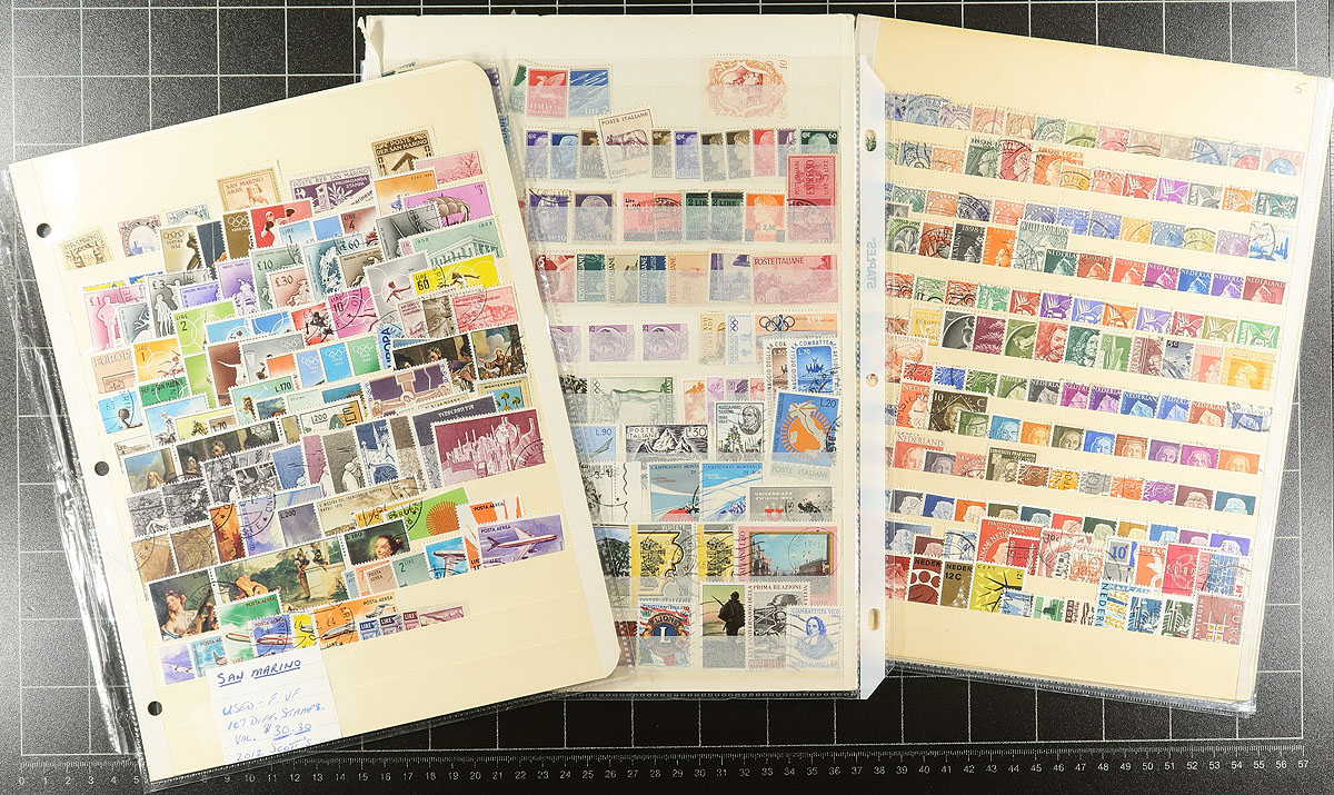 Europe. Large accumulation of used Europe, 1850's-1980s, containing many thousands of stamps in a variety of formats including several album pages, stock pages, a few stockbooks, and more. Most of the representation appears to be from Germany, Austria, Switzerland, Luxembourg, Netherlands, Poland, Italy, and a few more, noting singles, sets, partial sets, souvenir sheets, and back of the book material. Most of the material has been catalogued by the owner, with an older value totaling US$1,255.00, leaving potential finds, including better postmarks, to the dedicated collector. A good lot for the worldwide postmark hunter, overall fine to very fine. Estimate =