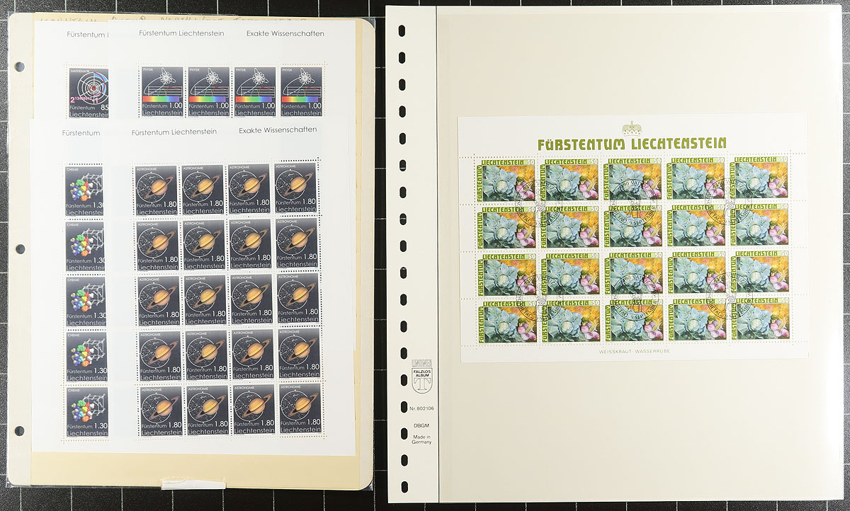Nice grouping of primarily never hinged Liechtenstein, 1960's-2008, containing mostly complete sheetlets of 20 for several issues, along with a few sets and souvenir sheets in several album pages. The lot generally ranges from Scott #424/1422, with the majority of material in sheetlets from the 1980's onwards. A spot check indicated sheetlets cataloguing $10 to $40 each, along with a few sheets with cto cancels. A nice clean lot for all collectors. Estimate =