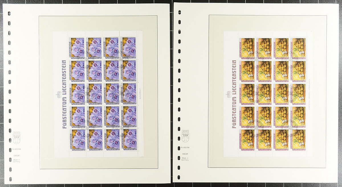Nice grouping of primarily never hinged Liechtenstein, 1960's-2008, containing mostly complete sheetlets of 20 for several issues, along with a few sets and souvenir sheets in several album pages. The lot generally ranges from Scott #424/1422, with the majority of material in sheetlets from the 1980's onwards. A spot check indicated sheetlets cataloguing $10 to $40 each, along with a few sheets with cto cancels. A nice clean lot for all collectors. Estimate =