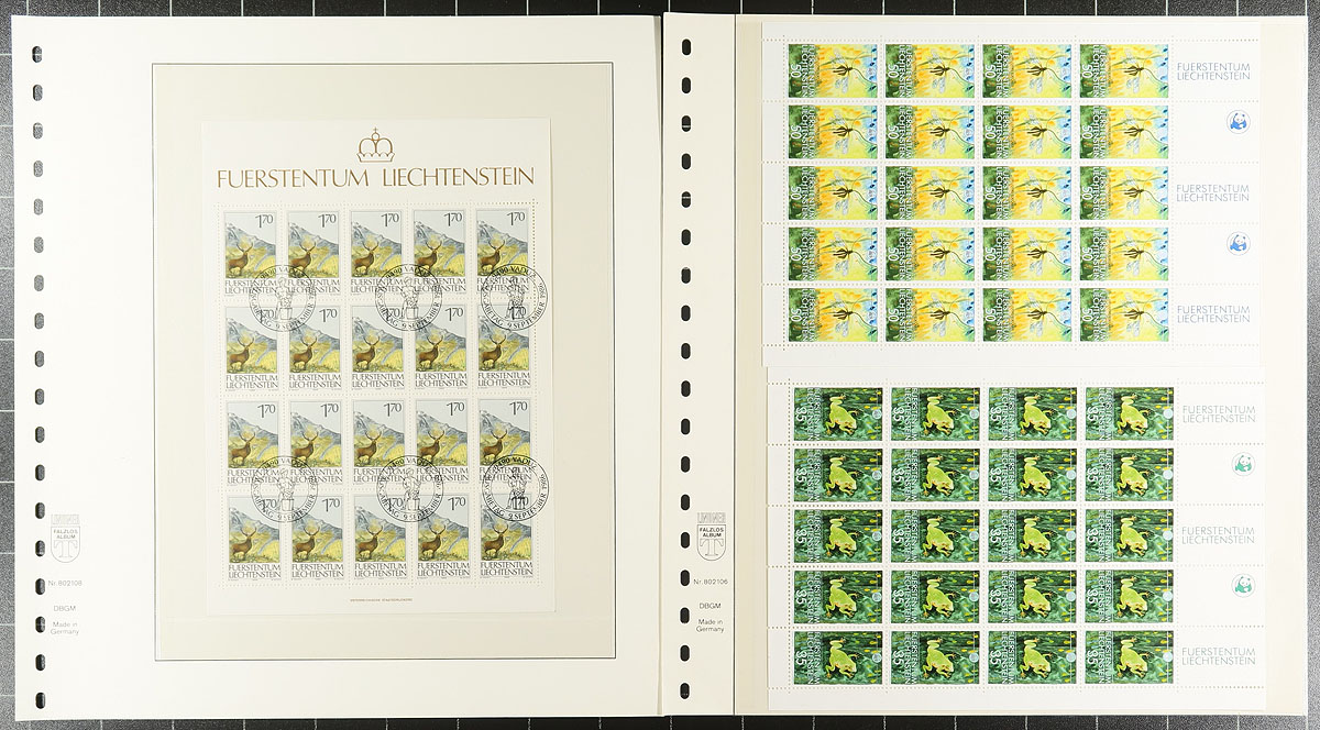 Nice grouping of primarily never hinged Liechtenstein, 1960's-2008, containing mostly complete sheetlets of 20 for several issues, along with a few sets and souvenir sheets in several album pages. The lot generally ranges from Scott #424/1422, with the majority of material in sheetlets from the 1980's onwards. A spot check indicated sheetlets cataloguing $10 to $40 each, along with a few sheets with cto cancels. A nice clean lot for all collectors. Estimate =