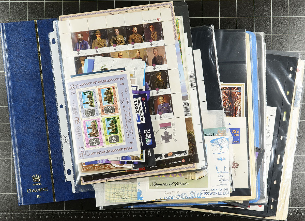 Nice grouping of primarily never hinged worldwide souvenir sheets and sheetlets, containing many hundreds in album or stock pages and a stockbook. The material generally ranges from the 1960's onwards with better representation from European countries (the stockbook alone contains over 100 different from Hungary), along with New Zealand and other British Commonwealth areas, Japan, and more. A spot check indicated some material cataloguing in the $5 to $10 range each, making this a nice lot for topical and thematic collectors, along with dealers looking for stock, overall very fine. Estimate =