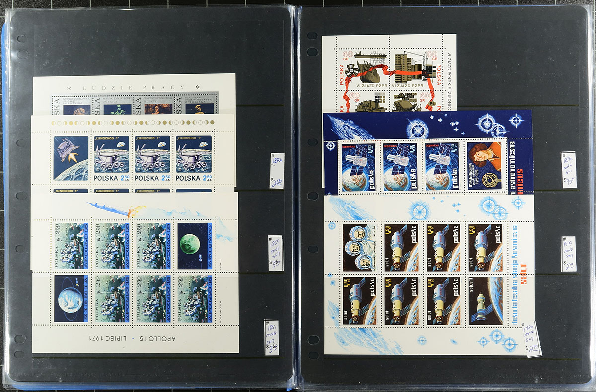 Nice grouping of primarily never hinged worldwide souvenir sheets and sheetlets, containing many hundreds in album or stock pages and a stockbook. The material generally ranges from the 1960's onwards with better representation from European countries (the stockbook alone contains over 100 different from Hungary), along with New Zealand and other British Commonwealth areas, Japan, and more. A spot check indicated some material cataloguing in the $5 to $10 range each, making this a nice lot for topical and thematic collectors, along with dealers looking for stock, overall very fine. Estimate =