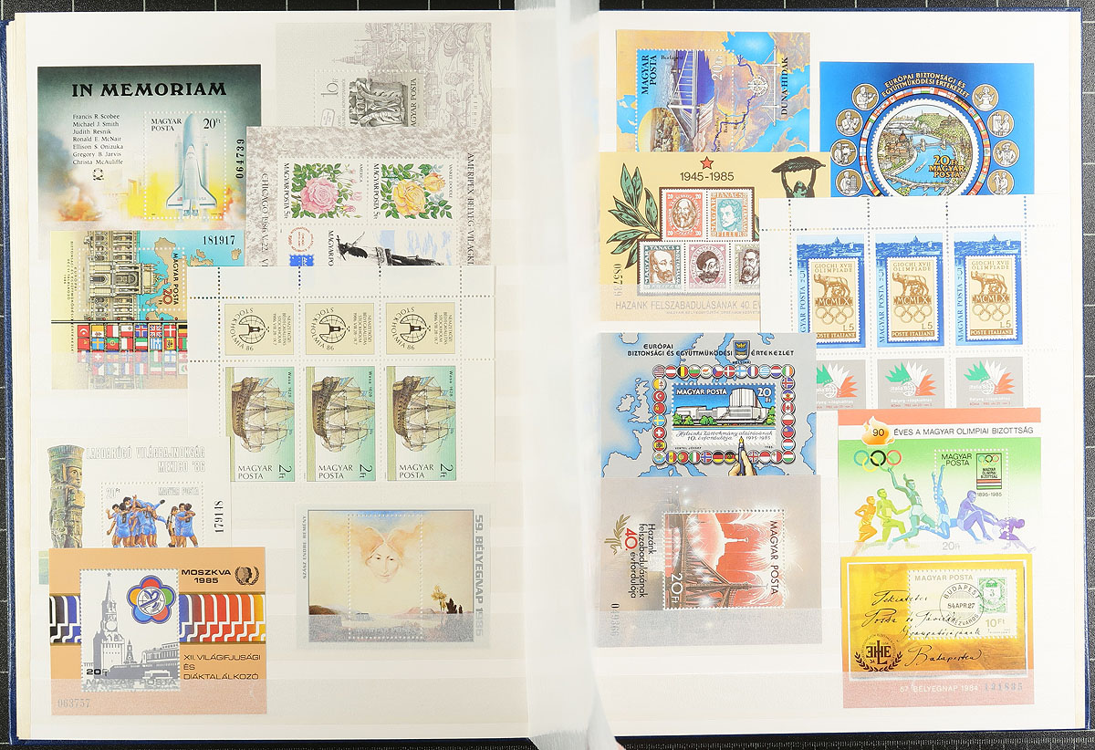 Nice grouping of primarily never hinged worldwide souvenir sheets and sheetlets, containing many hundreds in album or stock pages and a stockbook. The material generally ranges from the 1960's onwards with better representation from European countries (the stockbook alone contains over 100 different from Hungary), along with New Zealand and other British Commonwealth areas, Japan, and more. A spot check indicated some material cataloguing in the $5 to $10 range each, making this a nice lot for topical and thematic collectors, along with dealers looking for stock, overall very fine. Estimate =