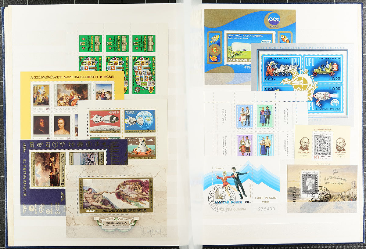 Nice grouping of primarily never hinged worldwide souvenir sheets and sheetlets, containing many hundreds in album or stock pages and a stockbook. The material generally ranges from the 1960's onwards with better representation from European countries (the stockbook alone contains over 100 different from Hungary), along with New Zealand and other British Commonwealth areas, Japan, and more. A spot check indicated some material cataloguing in the $5 to $10 range each, making this a nice lot for topical and thematic collectors, along with dealers looking for stock, overall very fine. Estimate =