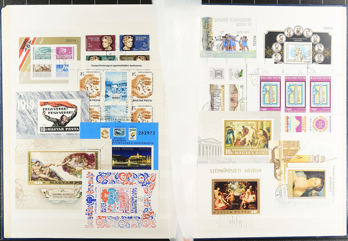 Nice grouping of primarily never hinged worldwide souvenir sheets and sheetlets, containing many hundreds in album or stock pages and a stockbook. The material generally ranges from the 1960's onwards with better representation from European countries (the stockbook alone contains over 100 different from Hungary), along with New Zealand and other British Commonwealth areas, Japan, and more. A spot check indicated some material cataloguing in the $5 to $10 range each, making this a nice lot for topical and thematic collectors, along with dealers looking for stock, overall very fine. Estimate =