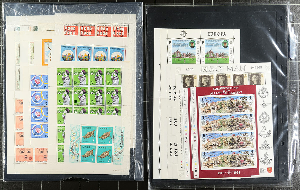Nice grouping of primarily never hinged worldwide souvenir sheets and sheetlets, containing many hundreds in album or stock pages and a stockbook. The material generally ranges from the 1960's onwards with better representation from European countries (the stockbook alone contains over 100 different from Hungary), along with New Zealand and other British Commonwealth areas, Japan, and more. A spot check indicated some material cataloguing in the $5 to $10 range each, making this a nice lot for topical and thematic collectors, along with dealers looking for stock, overall very fine. Estimate =