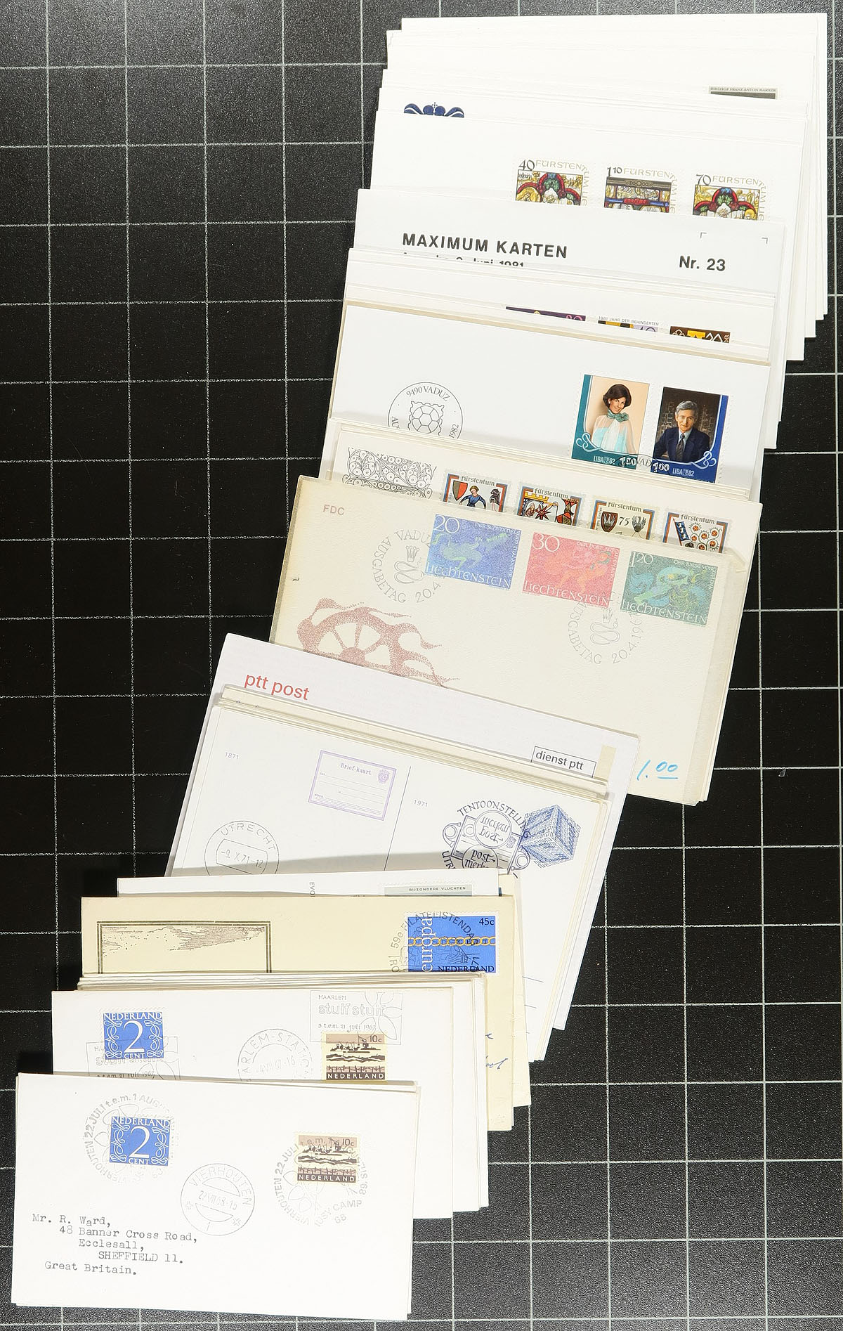 European FDC. Nice grouping of European country first day covers and maximum cards, 1960's-1990's, containing roughly 400 items in total, with representation from Austria, Netherlands, Liechtenstein, Poland, and Germany. We note roughly half the lot are maximum cards from Austria and Liechtenstein, along with first day covers from all countries noting singles, sets, and a few souvenir sheet frankings. A nice lot for dealers, topical and thematic collectors, as we encountered several suitable subjects, overall fine to very fine. Estimate =