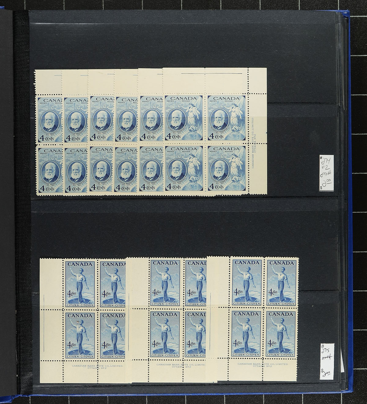 Lovely collection of primarily never hinged Canada plate blocks, 1947-1956, containing 318 plate blocks (some matched sets) neatly organized by Unitrade number, along with catalogue values, in a stockbook. The collection ranges from Unitrade #274/363, along with a few special delivery and official blocks (#O28/O39), and includes various plate numbers for definitive Karsh and Wildings issues. A spot check indicated a few blocks cataloguing $10 and up, with owner's 2011 Unitrade catalogue value for the lot totaling $1,329.00 (counted as fine). Duplication can be up to 8 for some issues. A nice collection that should be continued, overall fine to very fine. Estimate =