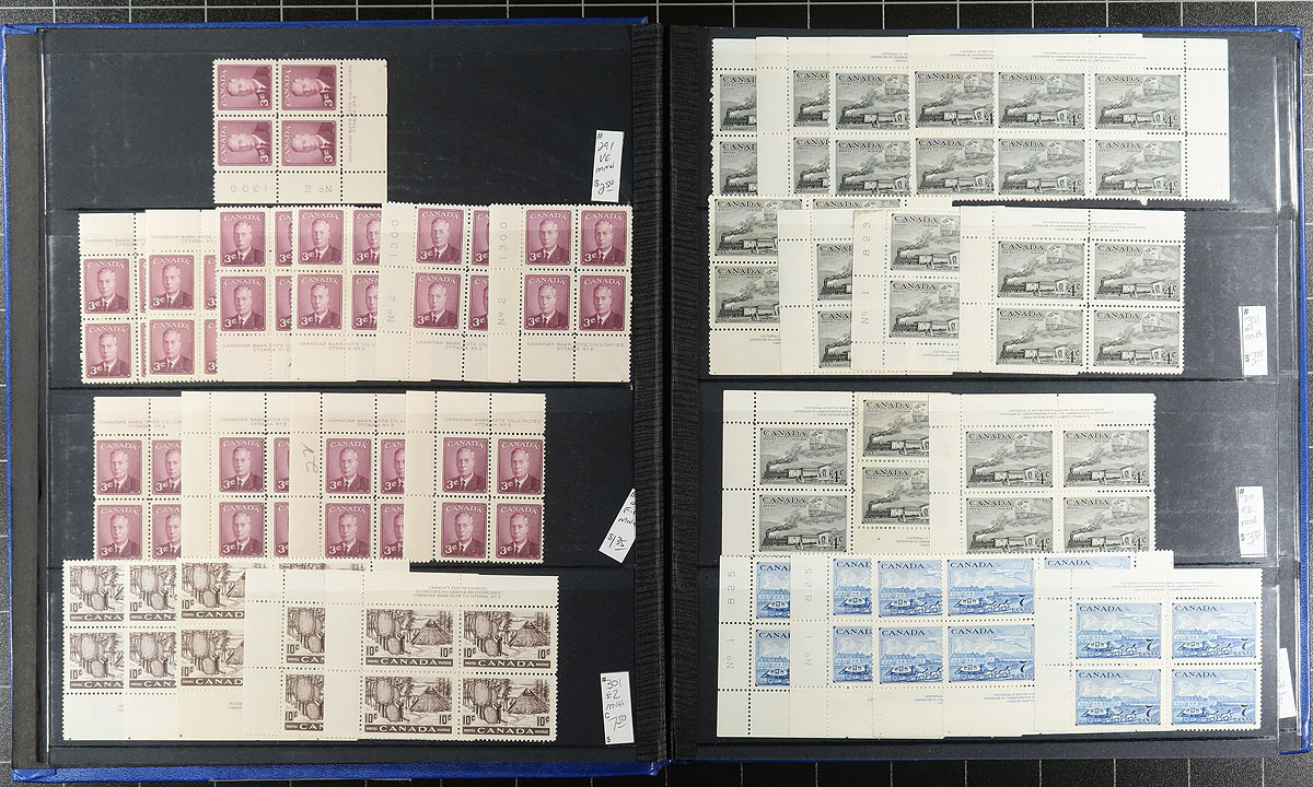 Lovely collection of primarily never hinged Canada plate blocks, 1947-1956, containing 318 plate blocks (some matched sets) neatly organized by Unitrade number, along with catalogue values, in a stockbook. The collection ranges from Unitrade #274/363, along with a few special delivery and official blocks (#O28/O39), and includes various plate numbers for definitive Karsh and Wildings issues. A spot check indicated a few blocks cataloguing $10 and up, with owner's 2011 Unitrade catalogue value for the lot totaling $1,329.00 (counted as fine). Duplication can be up to 8 for some issues. A nice collection that should be continued, overall fine to very fine. Estimate =