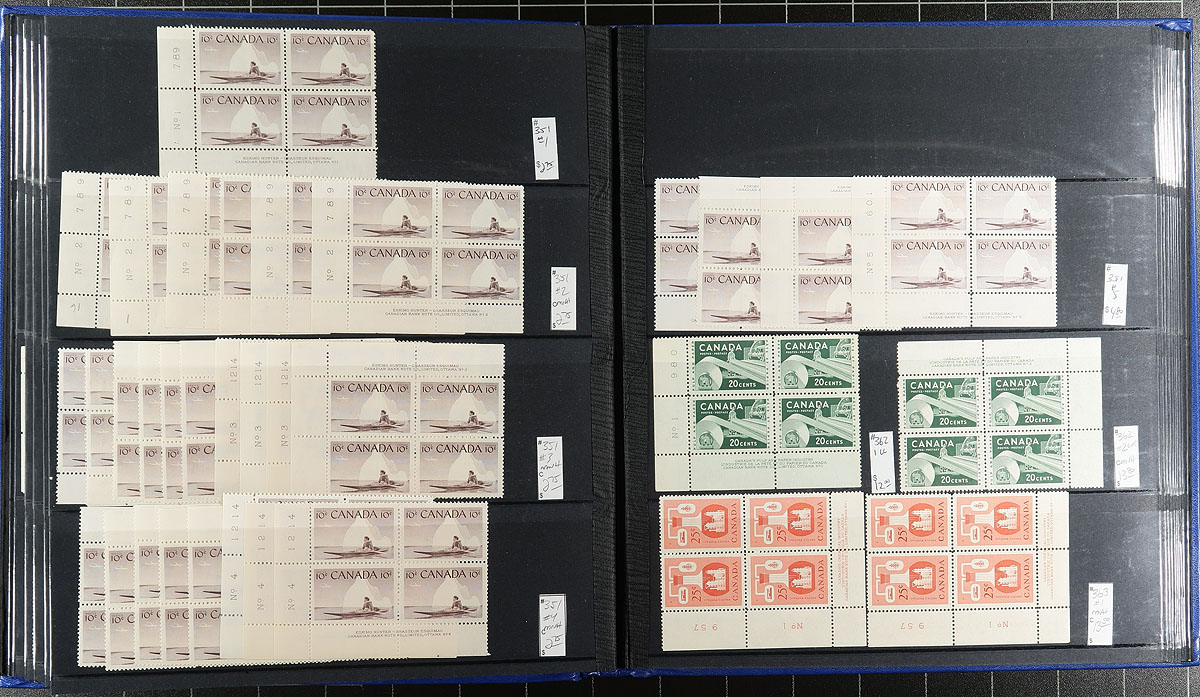 Lovely collection of primarily never hinged Canada plate blocks, 1947-1956, containing 318 plate blocks (some matched sets) neatly organized by Unitrade number, along with catalogue values, in a stockbook. The collection ranges from Unitrade #274/363, along with a few special delivery and official blocks (#O28/O39), and includes various plate numbers for definitive Karsh and Wildings issues. A spot check indicated a few blocks cataloguing $10 and up, with owner's 2011 Unitrade catalogue value for the lot totaling $1,329.00 (counted as fine). Duplication can be up to 8 for some issues. A nice collection that should be continued, overall fine to very fine. Estimate =
