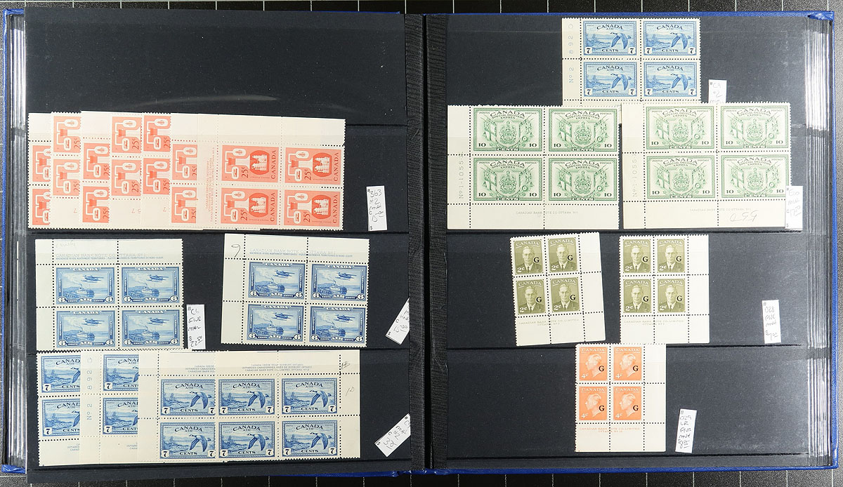 Lovely collection of primarily never hinged Canada plate blocks, 1947-1956, containing 318 plate blocks (some matched sets) neatly organized by Unitrade number, along with catalogue values, in a stockbook. The collection ranges from Unitrade #274/363, along with a few special delivery and official blocks (#O28/O39), and includes various plate numbers for definitive Karsh and Wildings issues. A spot check indicated a few blocks cataloguing $10 and up, with owner's 2011 Unitrade catalogue value for the lot totaling $1,329.00 (counted as fine). Duplication can be up to 8 for some issues. A nice collection that should be continued, overall fine to very fine. Estimate =