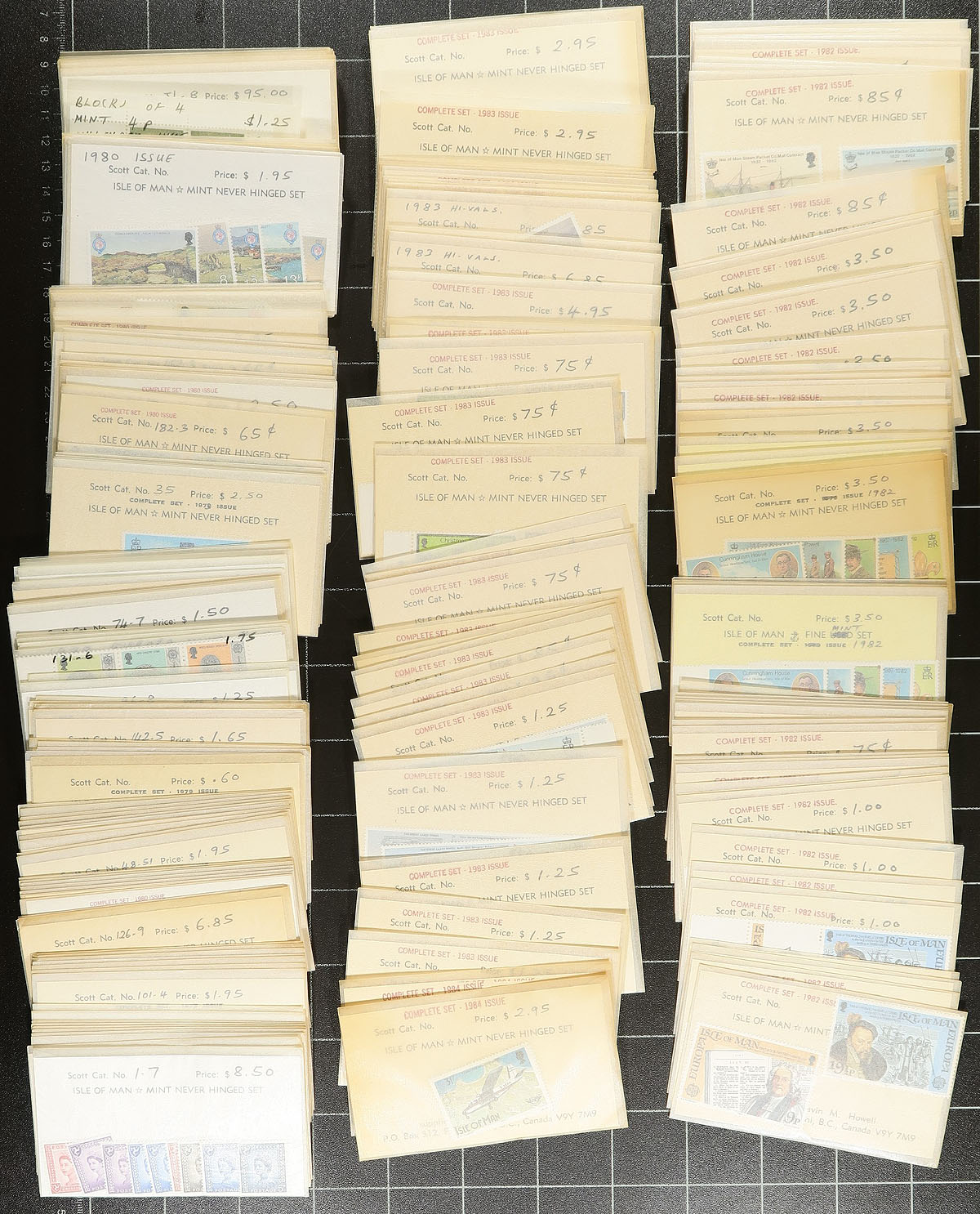 Large accumulation of never hinged Isle of Man, 1958-1993, containing over 1,500 stamps in a variety of formats in a box. The lot ranges from Scott #1/566, noting sets, several booklets (roughly 100 in total), gutter pairs, booklet panes, postage dues, souvenir sheets, etc. Many of the items are still in original post office packaging, along with 102 cards, and more. Owner's 2013 Scott catalogue value for the lot totals $2,394.00, with duplication up to 10 for a few booklets, and up to 2-3 per set. A nice lot for collectors and dealers alike. Owner's older 2013 Scott US$2394.00 =