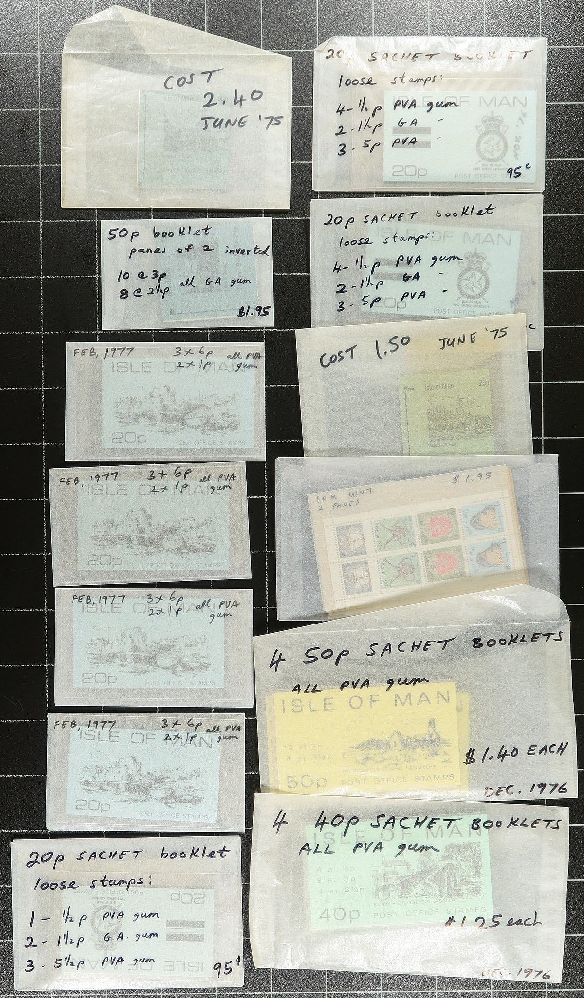 Large accumulation of never hinged Isle of Man, 1958-1993, containing over 1,500 stamps in a variety of formats in a box. The lot ranges from Scott #1/566, noting sets, several booklets (roughly 100 in total), gutter pairs, booklet panes, postage dues, souvenir sheets, etc. Many of the items are still in original post office packaging, along with 102 cards, and more. Owner's 2013 Scott catalogue value for the lot totals $2,394.00, with duplication up to 10 for a few booklets, and up to 2-3 per set. A nice lot for collectors and dealers alike. Owner's older 2013 Scott US$2394.00 =