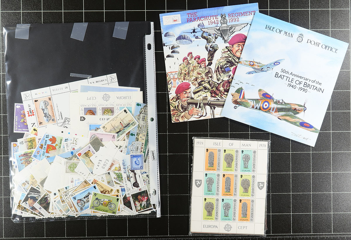 Large accumulation of never hinged Isle of Man, 1958-1993, containing over 1,500 stamps in a variety of formats in a box. The lot ranges from Scott #1/566, noting sets, several booklets (roughly 100 in total), gutter pairs, booklet panes, postage dues, souvenir sheets, etc. Many of the items are still in original post office packaging, along with 102 cards, and more. Owner's 2013 Scott catalogue value for the lot totals $2,394.00, with duplication up to 10 for a few booklets, and up to 2-3 per set. A nice lot for collectors and dealers alike. Owner's older 2013 Scott US$2394.00 =