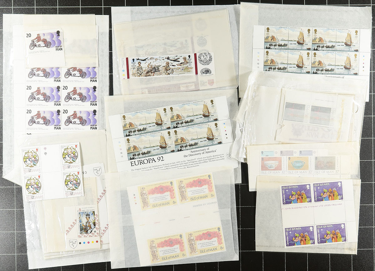 Large accumulation of never hinged Isle of Man, 1958-1993, containing over 1,500 stamps in a variety of formats in a box. The lot ranges from Scott #1/566, noting sets, several booklets (roughly 100 in total), gutter pairs, booklet panes, postage dues, souvenir sheets, etc. Many of the items are still in original post office packaging, along with 102 cards, and more. Owner's 2013 Scott catalogue value for the lot totals $2,394.00, with duplication up to 10 for a few booklets, and up to 2-3 per set. A nice lot for collectors and dealers alike. Owner's older 2013 Scott US$2394.00 =