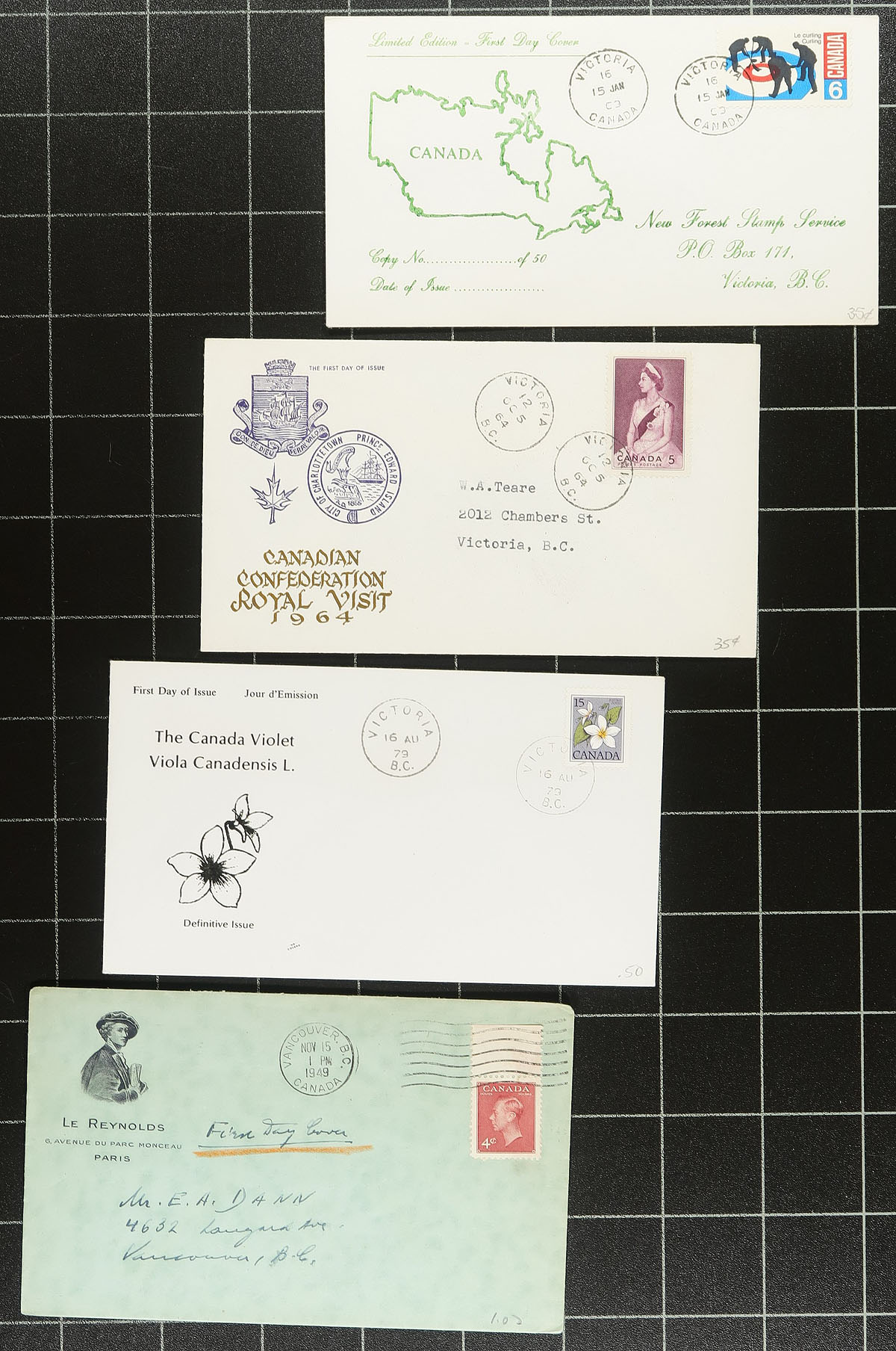 First Day Covers. Nice collection of Canada first day covers collected for British Columbia postmarks, 1960's-1980's, containing roughly 250 covers in a box, mostly single frankings and several private cachets including NR and Rose Craft. Postmarks are primarily from Victoria and Vancouver, along with a few others. A few covers with corner bends and soiling, still a nice group for the British Columbia collector. Estimate =