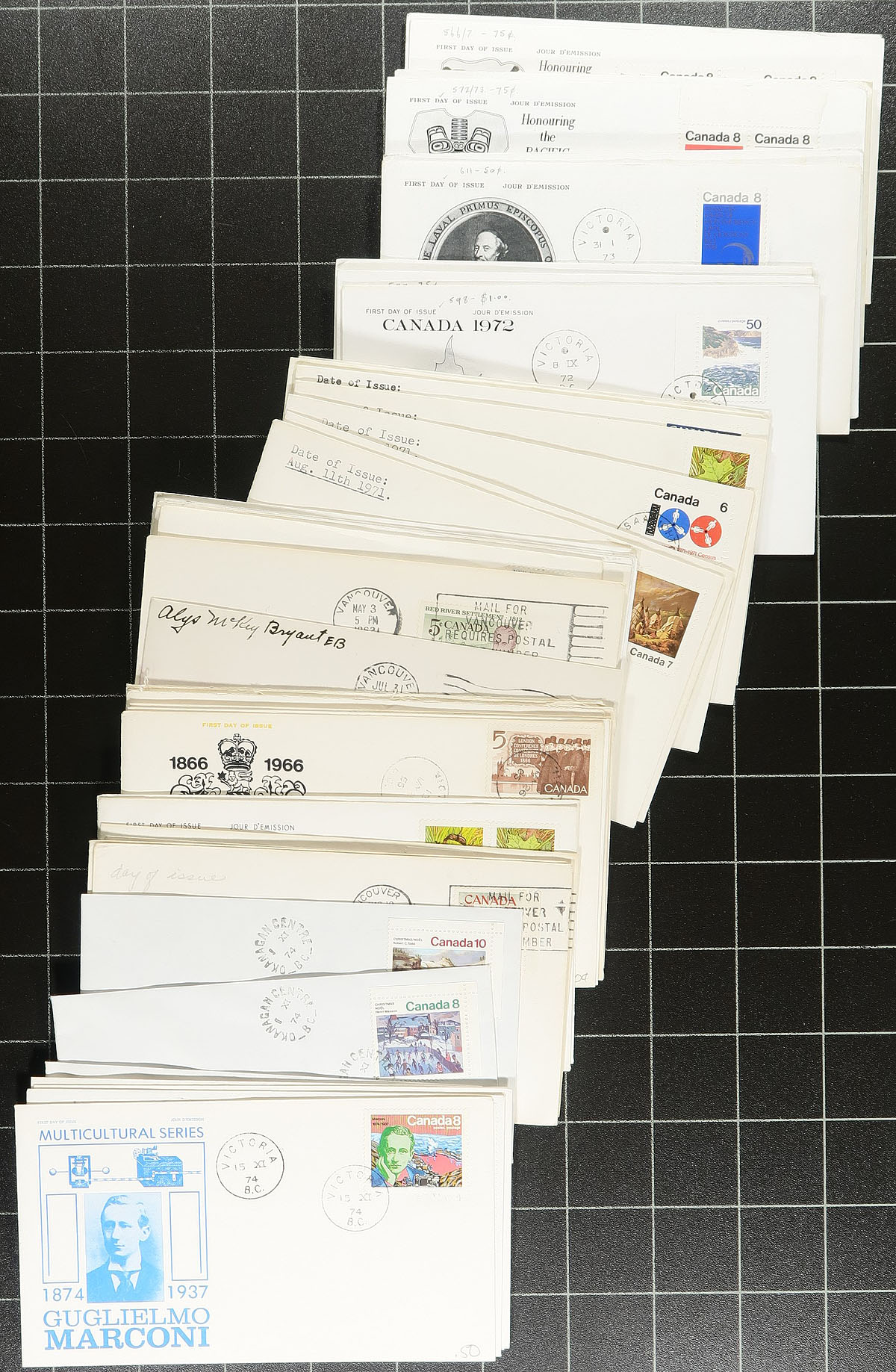 First Day Covers. Nice collection of Canada first day covers collected for British Columbia postmarks, 1960's-1980's, containing roughly 250 covers in a box, mostly single frankings and several private cachets including NR and Rose Craft. Postmarks are primarily from Victoria and Vancouver, along with a few others. A few covers with corner bends and soiling, still a nice group for the British Columbia collector. Estimate =
