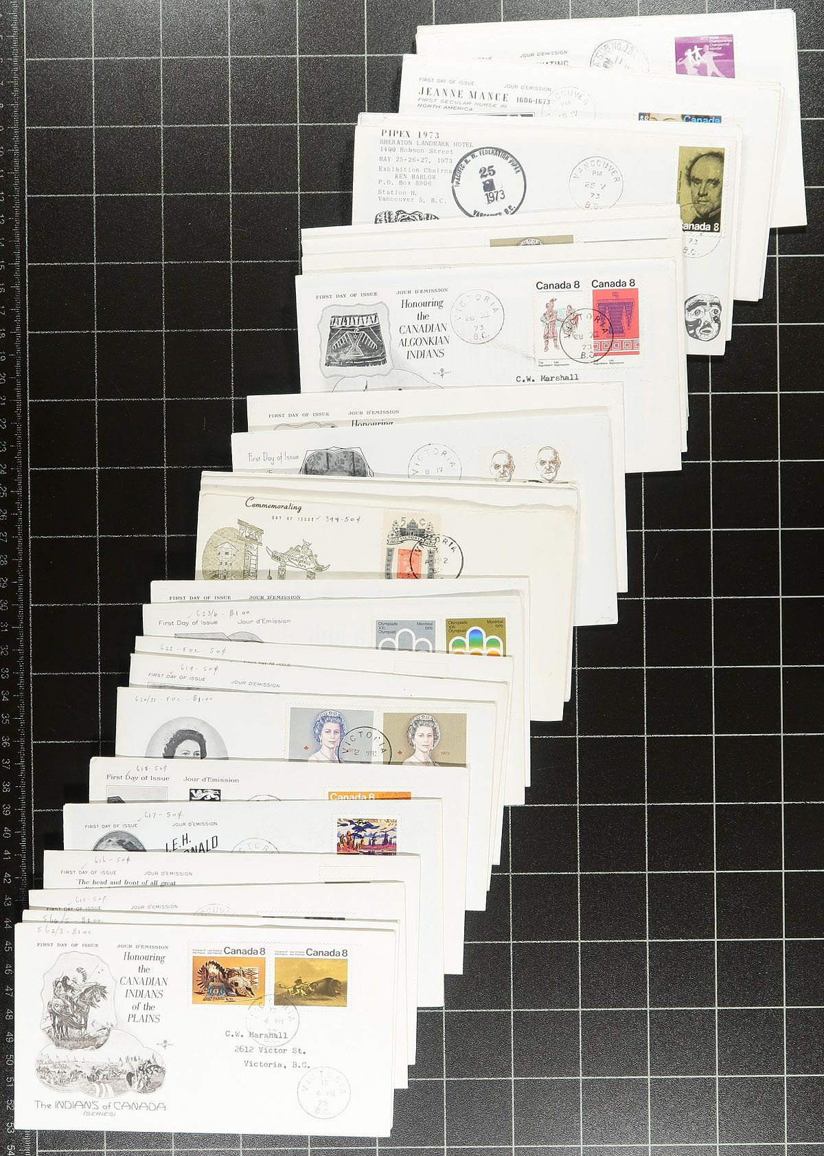 First Day Covers. Nice collection of Canada first day covers collected for British Columbia postmarks, 1960's-1980's, containing roughly 250 covers in a box, mostly single frankings and several private cachets including NR and Rose Craft. Postmarks are primarily from Victoria and Vancouver, along with a few others. A few covers with corner bends and soiling, still a nice group for the British Columbia collector. Estimate =