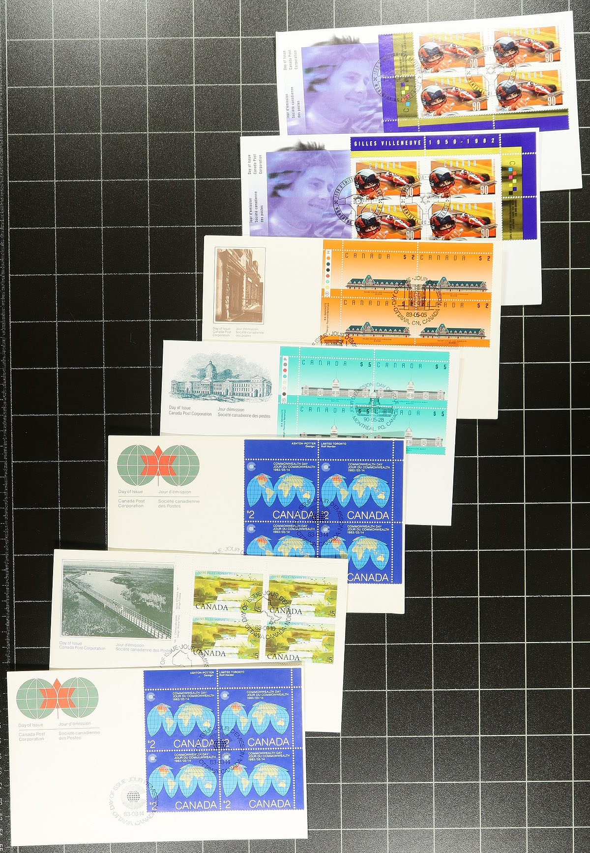 First Day Covers. A lovely collection of Canada first day covers, 1979-1998, containing many hundreds of covers (roughly 750), all neatly arranged by year in a box. A spot check indicated singles and blocks most (with one of each for many issues), sets, a few souvenir sheet frankings and . high denomination frankings. Most years appear to be complete with some covers cataloguing $10 and up. A nice clean lot for collectors and dealers alike. Estimate =