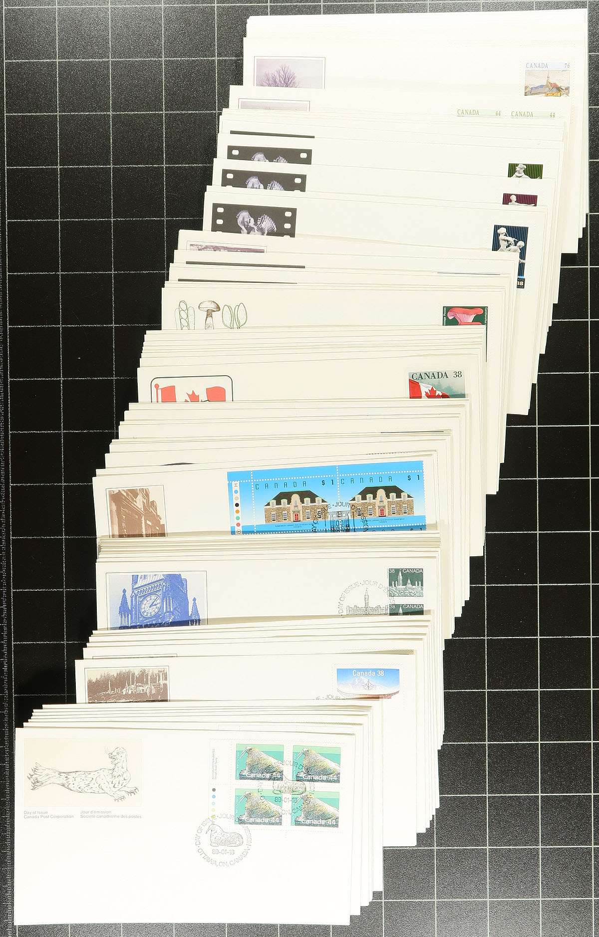First Day Covers. A lovely collection of Canada first day covers, 1979-1998, containing many hundreds of covers (roughly 750), all neatly arranged by year in a box. A spot check indicated singles and blocks most (with one of each for many issues), sets, a few souvenir sheet frankings and . high denomination frankings. Most years appear to be complete with some covers cataloguing $10 and up. A nice clean lot for collectors and dealers alike. Estimate =