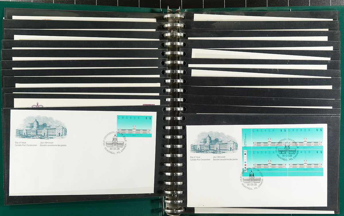 First Day Covers. Assortment of Canada first day covers, 1970's-1990's, roughly 500 in total in 6 cover albums. We spotted singles, sets, souvenir sheets, plate blocks, and high denomination frankings, with some issues having a variety of each. Also included are a few pre-1972 covers with private cachets, noting a few covers cataloguing $8 to $12 each. Duplication up to 1 to 2 for a few issues, overall a nice lot for collectors and dealers. Estimate =
