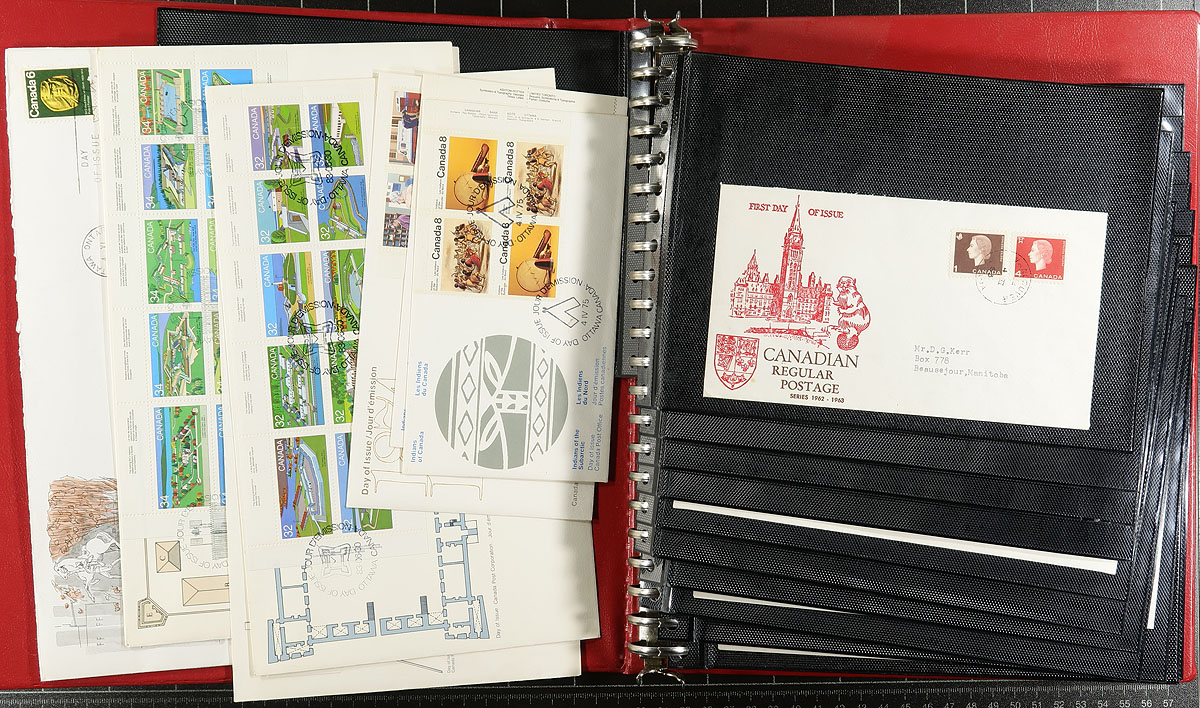 First Day Covers. Assortment of Canada first day covers, 1970's-1990's, roughly 500 in total in 6 cover albums. We spotted singles, sets, souvenir sheets, plate blocks, and high denomination frankings, with some issues having a variety of each. Also included are a few pre-1972 covers with private cachets, noting a few covers cataloguing $8 to $12 each. Duplication up to 1 to 2 for a few issues, overall a nice lot for collectors and dealers. Estimate =