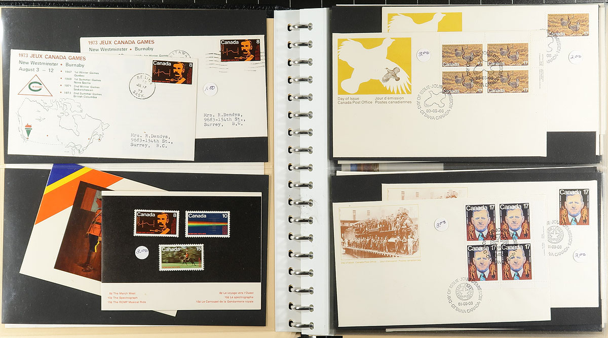 First Day Covers. Assortment of Canada first day covers, 1970's-1990's, roughly 500 in total in 6 cover albums. We spotted singles, sets, souvenir sheets, plate blocks, and high denomination frankings, with some issues having a variety of each. Also included are a few pre-1972 covers with private cachets, noting a few covers cataloguing $8 to $12 each. Duplication up to 1 to 2 for a few issues, overall a nice lot for collectors and dealers. Estimate =
