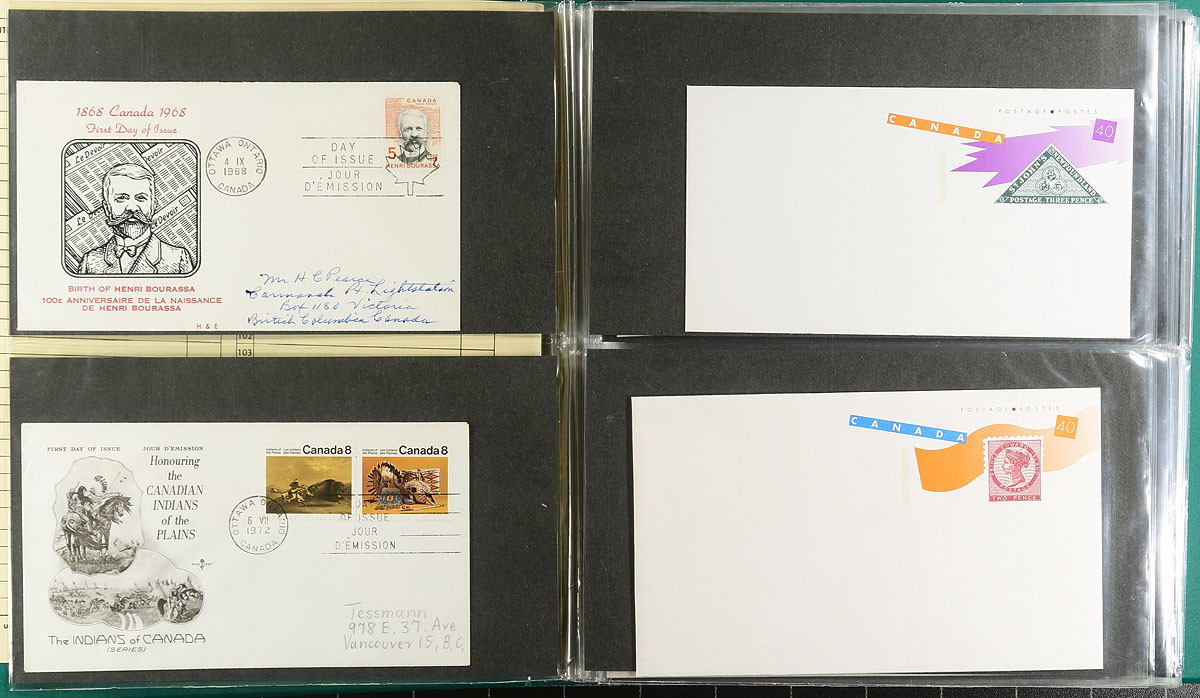 First Day Covers. Assortment of Canada first day covers, 1970's-1990's, roughly 500 in total in 6 cover albums. We spotted singles, sets, souvenir sheets, plate blocks, and high denomination frankings, with some issues having a variety of each. Also included are a few pre-1972 covers with private cachets, noting a few covers cataloguing $8 to $12 each. Duplication up to 1 to 2 for a few issues, overall a nice lot for collectors and dealers. Estimate =