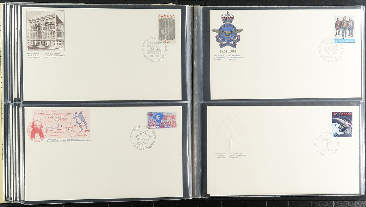 First Day Covers. Assortment of Canada first day covers, 1970's-1990's, roughly 500 in total in 6 cover albums. We spotted singles, sets, souvenir sheets, plate blocks, and high denomination frankings, with some issues having a variety of each. Also included are a few pre-1972 covers with private cachets, noting a few covers cataloguing $8 to $12 each. Duplication up to 1 to 2 for a few issues, overall a nice lot for collectors and dealers. Estimate =