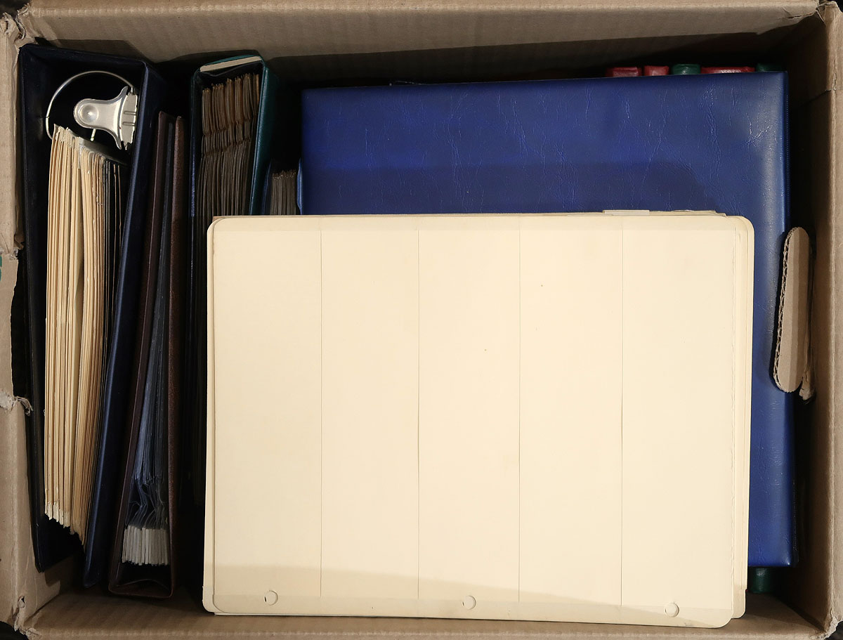 Nice gently used assortment of useful supplies including 5 stockbooks, 8 cover albums for short and long covers, loose and a binder full of manila stock pages (roughly 50 plus), and a box of roughly 700 of dealer stock cards (mostly 102's). Most items have light pencil markings, but still useful at a fraction of the original retail price. Estimate =
