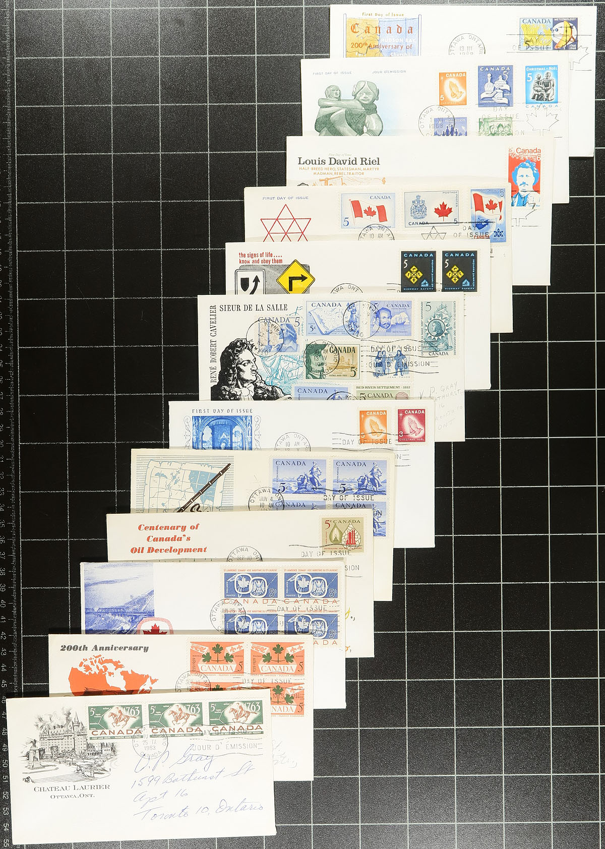 First Day Covers. Lovely collection of Canada private cachet first day covers, 1958-1970, containing roughly 375 covers in box. The covers are all addressed to "V.P. Gray" noting singles, pairs and a few block frankings, along with a few covers franked "topically" such as Christmas stamps, or Provinces. The collection has a number of cachet makers including Rose Craft, Capital, Jackson, Cole, Art Craft, Caneco, and a few more, along with covers from the Chateau Laurier in Ottawa, Ontario. We note duplication up to 3 for some issues, along with a 1 to 2 different cachets for several issues. A lovely collection that would be difficult to replicate and should satisfy collectors and dealers alike. Estimate =