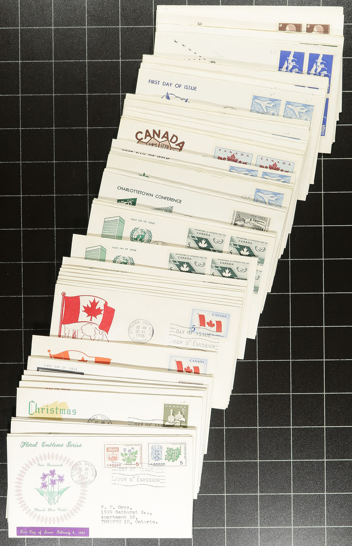 First Day Covers. Lovely collection of Canada private cachet first day covers, 1958-1970, containing roughly 375 covers in box. The covers are all addressed to "V.P. Gray" noting singles, pairs and a few block frankings, along with a few covers franked "topically" such as Christmas stamps, or Provinces. The collection has a number of cachet makers including Rose Craft, Capital, Jackson, Cole, Art Craft, Caneco, and a few more, along with covers from the Chateau Laurier in Ottawa, Ontario. We note duplication up to 3 for some issues, along with a 1 to 2 different cachets for several issues. A lovely collection that would be difficult to replicate and should satisfy collectors and dealers alike. Estimate =