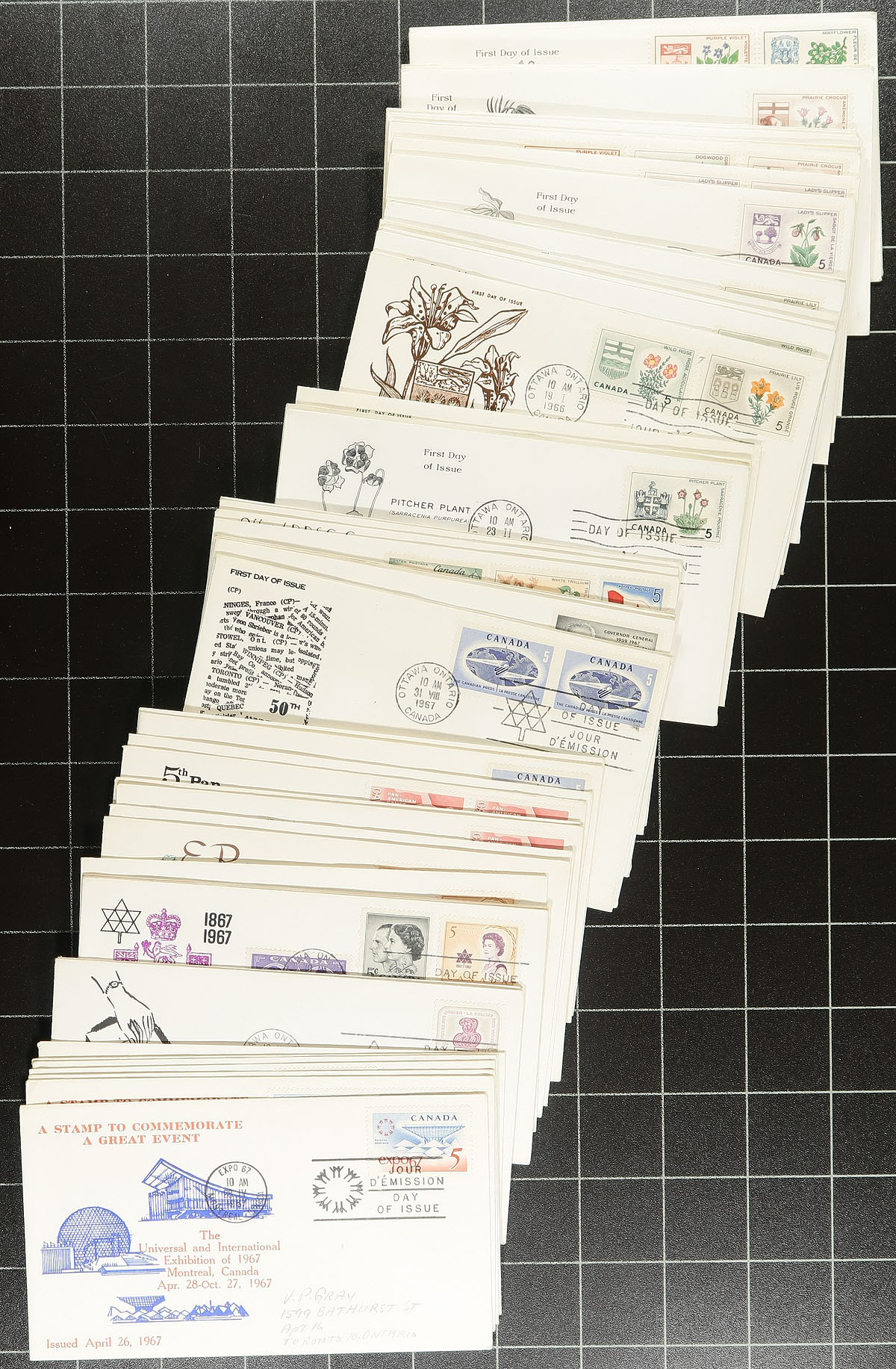 First Day Covers. Lovely collection of Canada private cachet first day covers, 1958-1970, containing roughly 375 covers in box. The covers are all addressed to "V.P. Gray" noting singles, pairs and a few block frankings, along with a few covers franked "topically" such as Christmas stamps, or Provinces. The collection has a number of cachet makers including Rose Craft, Capital, Jackson, Cole, Art Craft, Caneco, and a few more, along with covers from the Chateau Laurier in Ottawa, Ontario. We note duplication up to 3 for some issues, along with a 1 to 2 different cachets for several issues. A lovely collection that would be difficult to replicate and should satisfy collectors and dealers alike. Estimate =