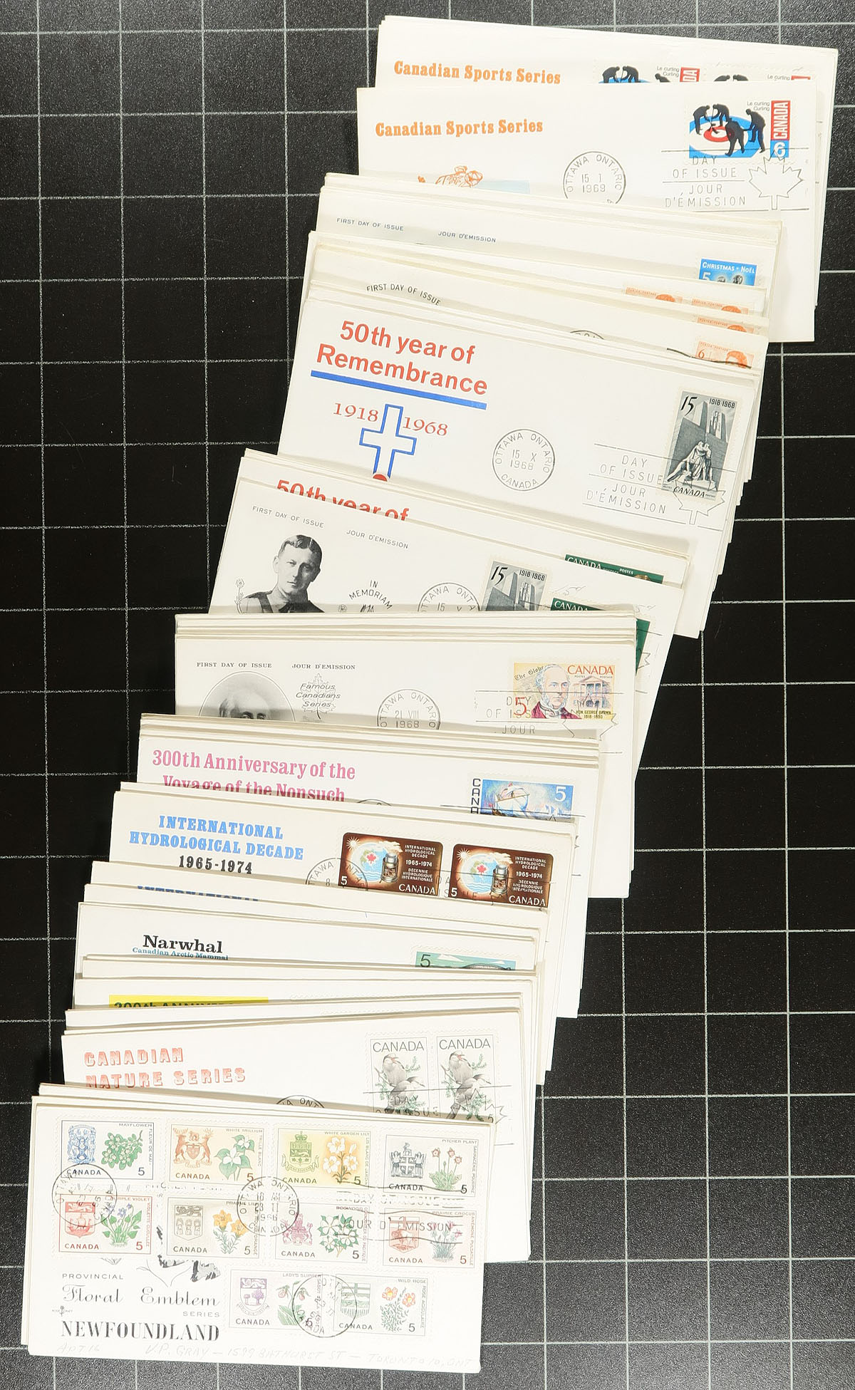 First Day Covers. Lovely collection of Canada private cachet first day covers, 1958-1970, containing roughly 375 covers in box. The covers are all addressed to "V.P. Gray" noting singles, pairs and a few block frankings, along with a few covers franked "topically" such as Christmas stamps, or Provinces. The collection has a number of cachet makers including Rose Craft, Capital, Jackson, Cole, Art Craft, Caneco, and a few more, along with covers from the Chateau Laurier in Ottawa, Ontario. We note duplication up to 3 for some issues, along with a 1 to 2 different cachets for several issues. A lovely collection that would be difficult to replicate and should satisfy collectors and dealers alike. Estimate =