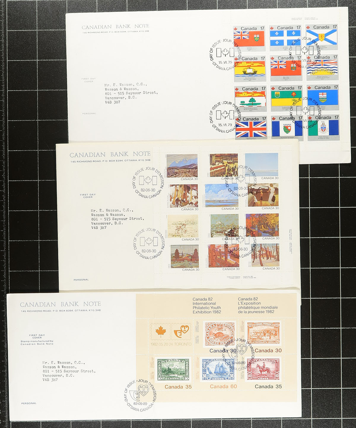 First Day Covers. Interesting collection of Canada first day covers, containing roughly 180 Canadian Bank Note envelopes, and roughly 40 from the British American Bank Note company, generally ranging from the 1970's and 1980's, having single and sets franking. A clean collection ideal for collectors and dealers alike, overall very fine. Estimate =