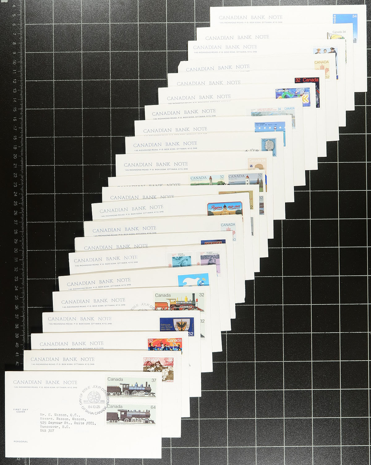 First Day Covers. Interesting collection of Canada first day covers, containing roughly 180 Canadian Bank Note envelopes, and roughly 40 from the British American Bank Note company, generally ranging from the 1970's and 1980's, having single and sets franking. A clean collection ideal for collectors and dealers alike, overall very fine. Estimate =