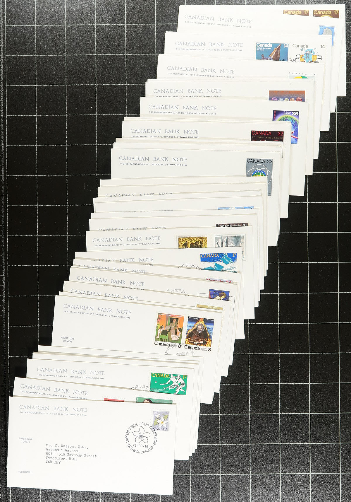 First Day Covers. Interesting collection of Canada first day covers, containing roughly 180 Canadian Bank Note envelopes, and roughly 40 from the British American Bank Note company, generally ranging from the 1970's and 1980's, having single and sets franking. A clean collection ideal for collectors and dealers alike, overall very fine. Estimate =