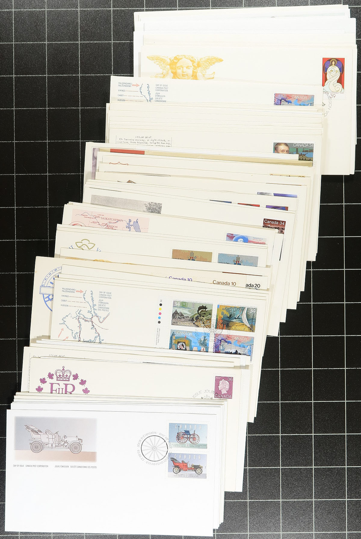 First Day Covers. Accumulation of Canada first day covers, 1950's-1990's, containing many hundreds of covers (roughly 750), noting singles, sets, souvenir sheets, plate blocks, coils, booklets, and a few high denomination frankings. The lot also contains a few oversized covers, notably with "Art" plate blocks, along with private cachet and uncacheted covers from the 1950's onwards, and some post office announcements. Duplication from 3 to 5 possible for some issues. A nice lot for the collector or dealer looking to fill up dollar boxes, overall fine to very fine. Estimate =