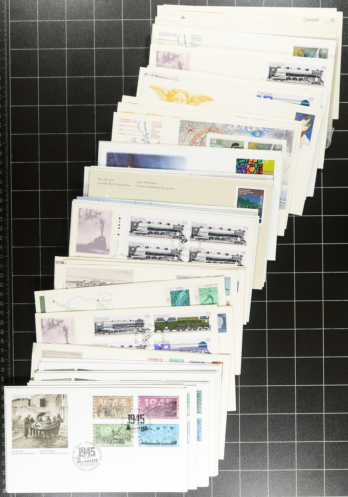 First Day Covers. Accumulation of Canada first day covers, 1950's-1990's, containing many hundreds of covers (roughly 750), noting singles, sets, souvenir sheets, plate blocks, coils, booklets, and a few high denomination frankings. The lot also contains a few oversized covers, notably with "Art" plate blocks, along with private cachet and uncacheted covers from the 1950's onwards, and some post office announcements. Duplication from 3 to 5 possible for some issues. A nice lot for the collector or dealer looking to fill up dollar boxes, overall fine to very fine. Estimate =