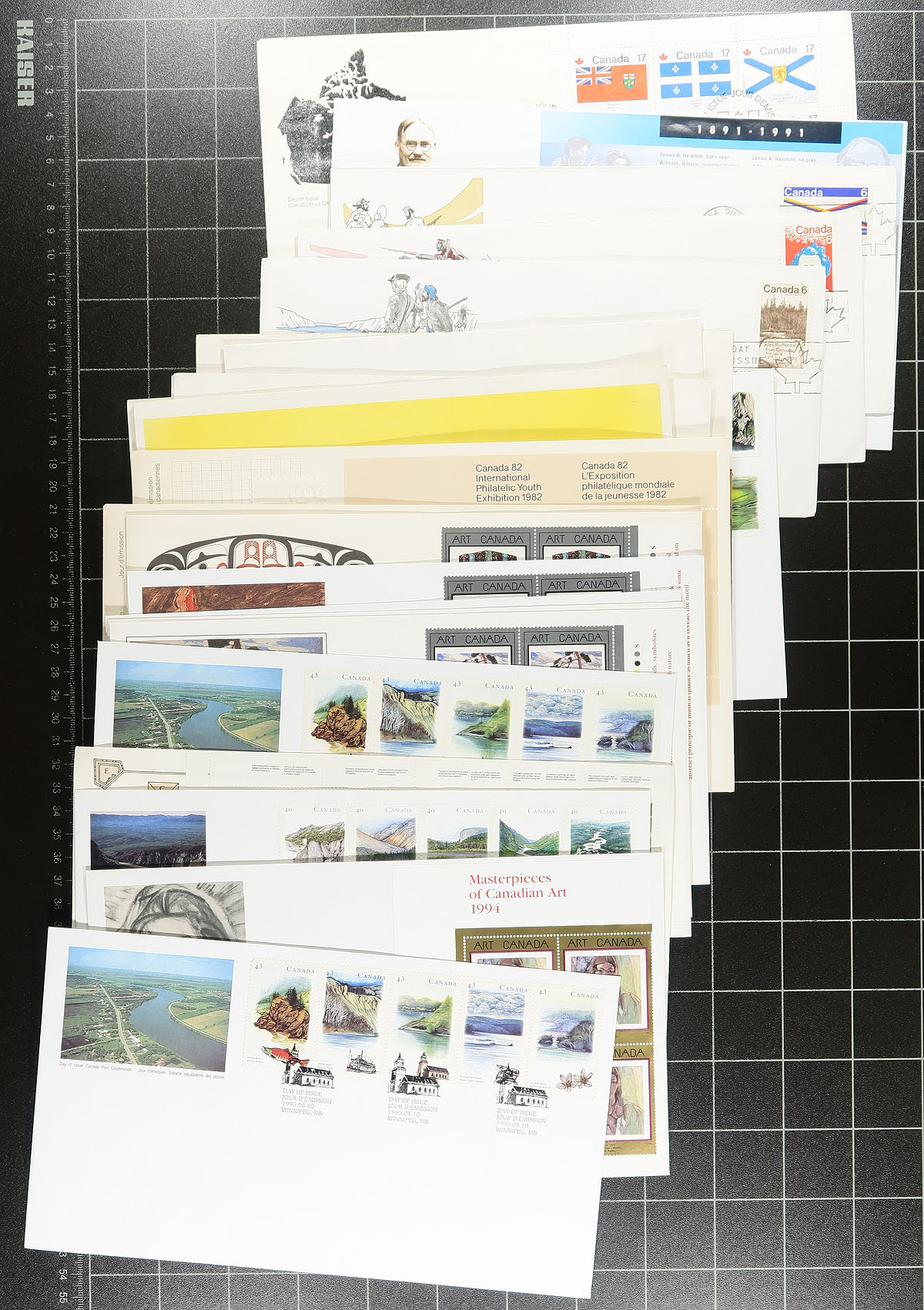 First Day Covers. Accumulation of Canada first day covers, 1950's-1990's, containing many hundreds of covers (roughly 750), noting singles, sets, souvenir sheets, plate blocks, coils, booklets, and a few high denomination frankings. The lot also contains a few oversized covers, notably with "Art" plate blocks, along with private cachet and uncacheted covers from the 1950's onwards, and some post office announcements. Duplication from 3 to 5 possible for some issues. A nice lot for the collector or dealer looking to fill up dollar boxes, overall fine to very fine. Estimate =